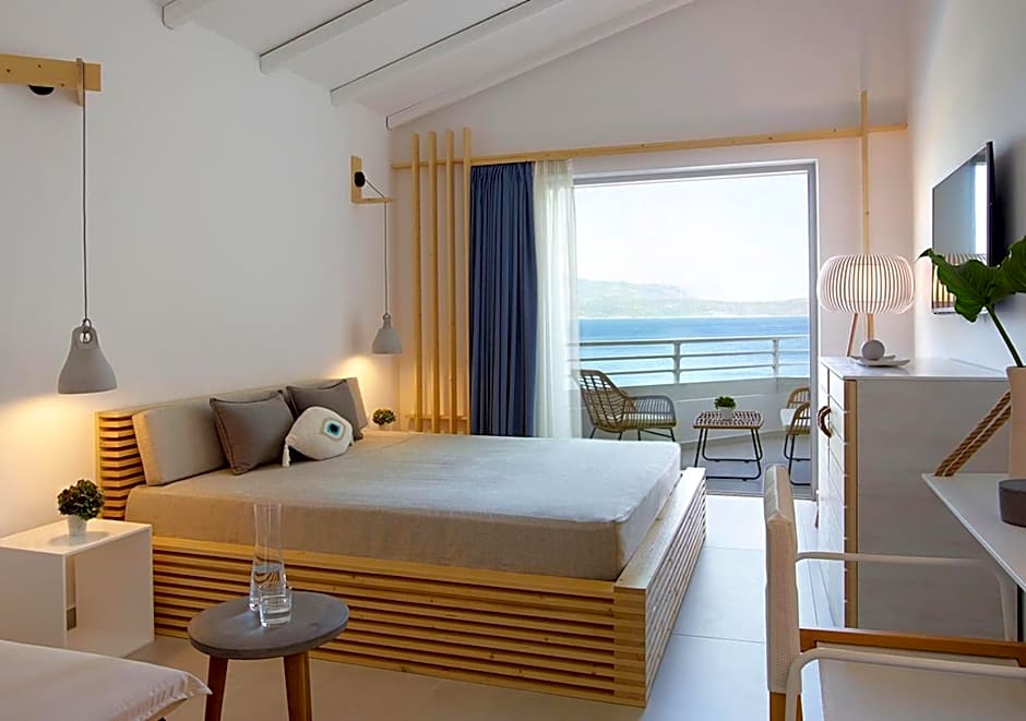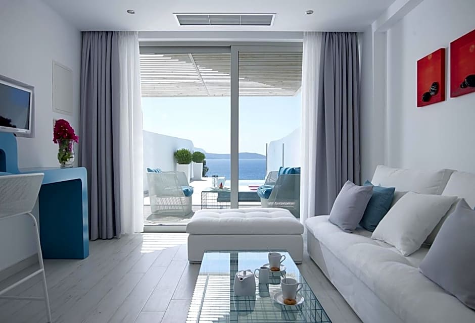 Sun-kissed days unfold along a private beach with direct ocean access and two seasonal pools—an outdoor pool for sunny swims and an indoor pool for year-round dips. Free beach umbrellas and loungers set a relaxed tone, while an adults-only vibe adds a serene, refined pace. A tennis court, plus a sun deck, terrace, and garden, provide plenty of space to linger and soak up the Cycladic breeze.